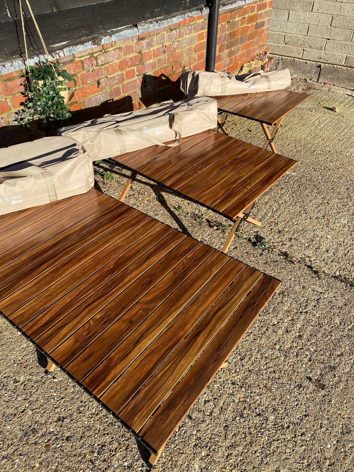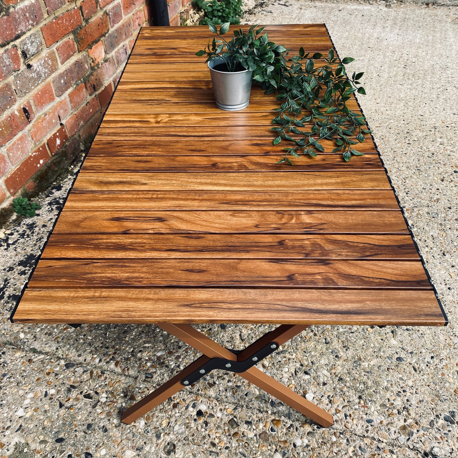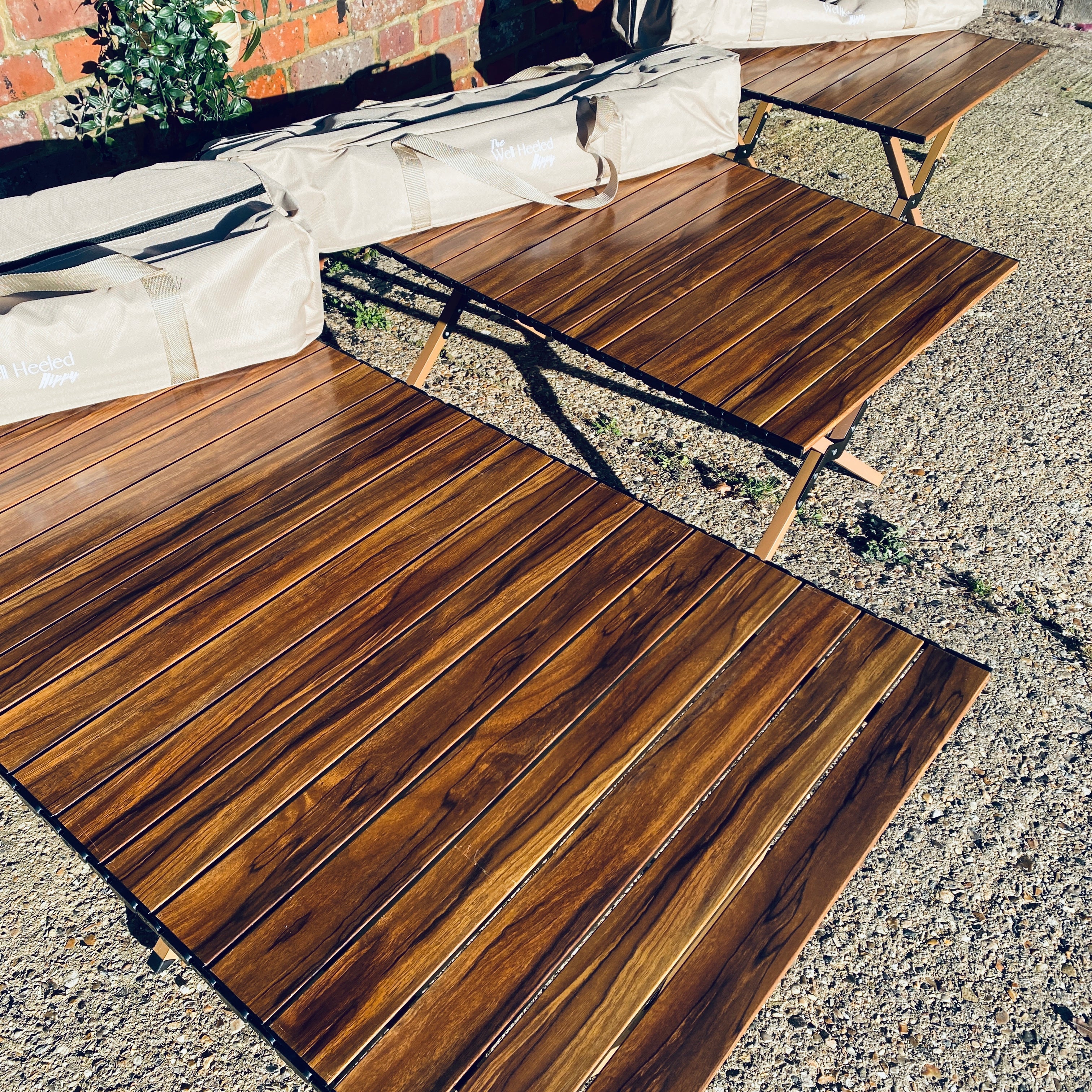 Our wood grain effect aluminium tables are so realistic that you wouldn't guess. Durable, lightweight and each slat is individual so each table is unique. In three sizes and each folds into a small portable bag.