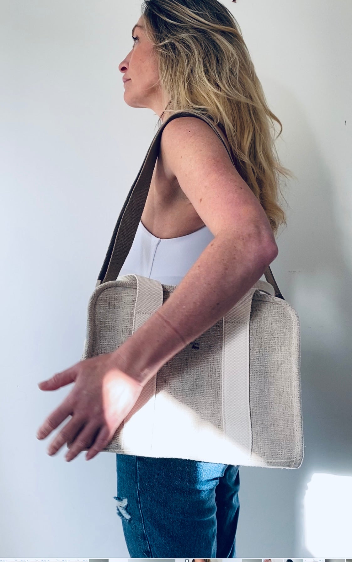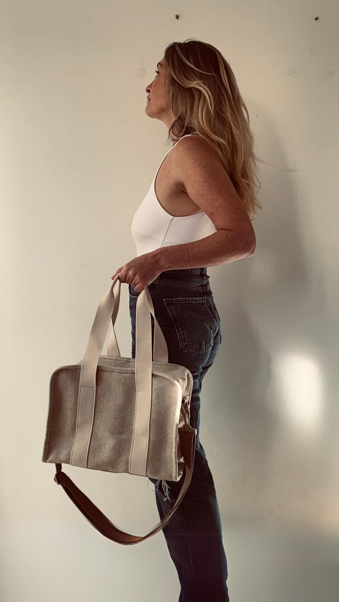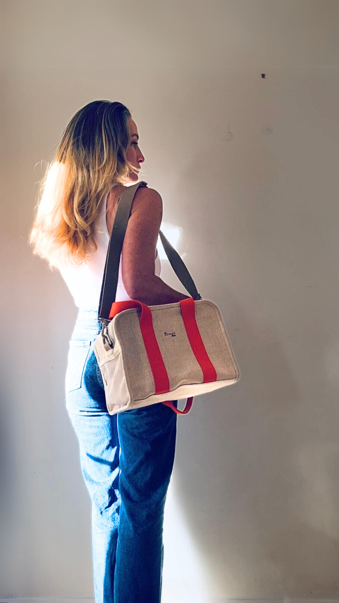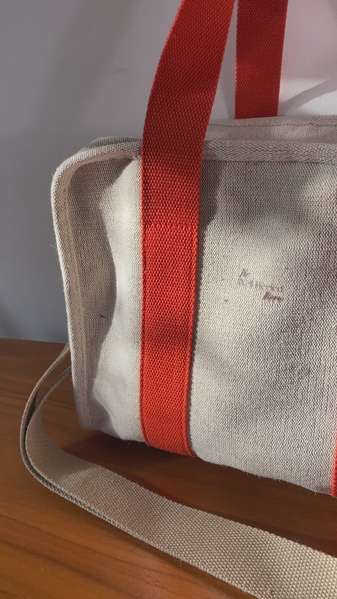 In Natural Linen with a choice of Cream, Midnight Blue or Tangerine Orange Straps.